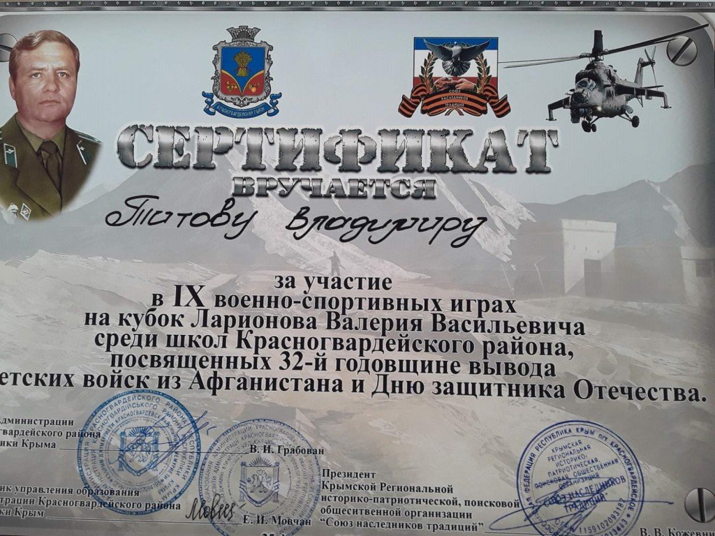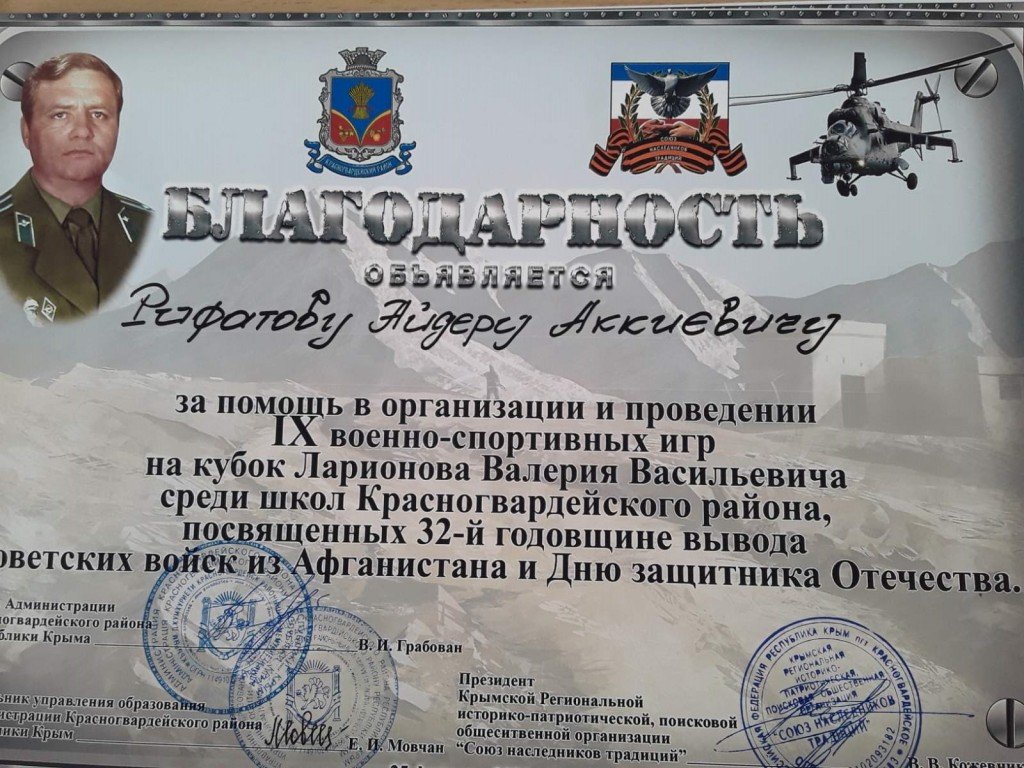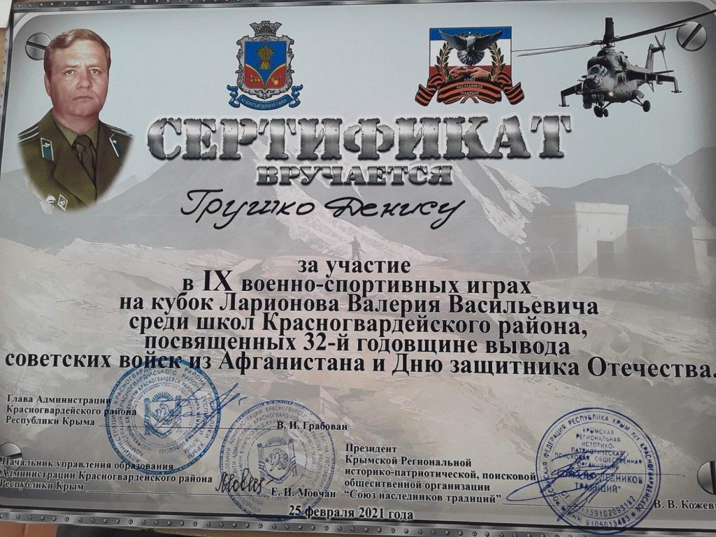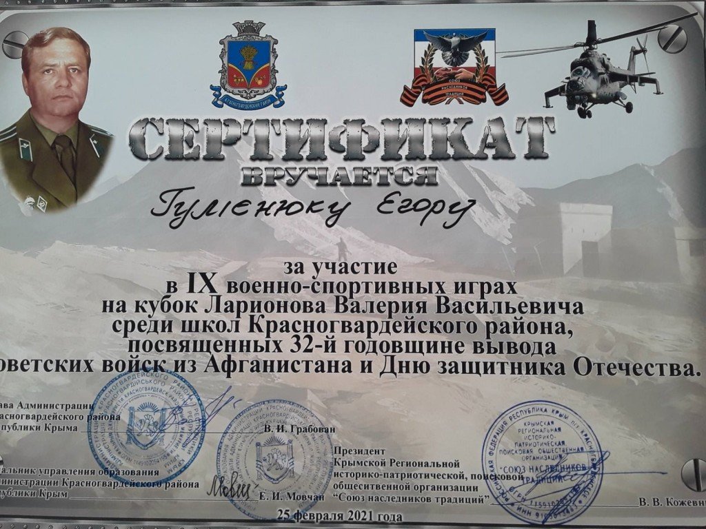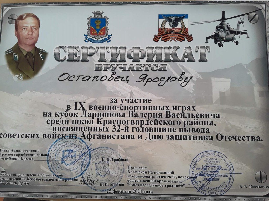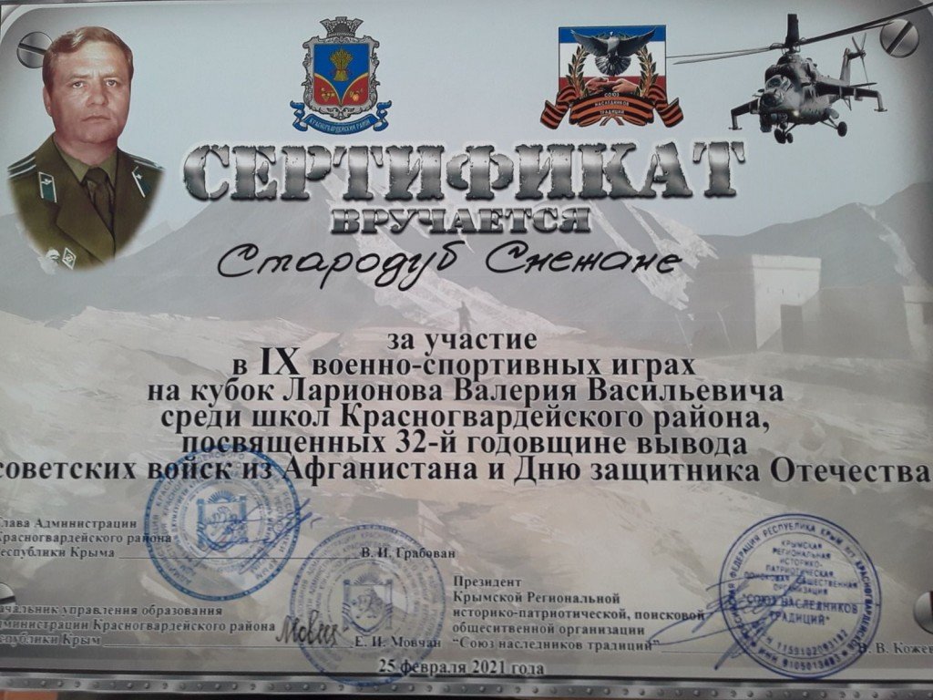 Участие в IX военно-спортивных играх на кубок имени Ларионова Валерия Васильевича среди школ Красногвардейского района, посвященных 32-й годовщине вывода советских войск из Афганистана и Дню защитника Отечества.